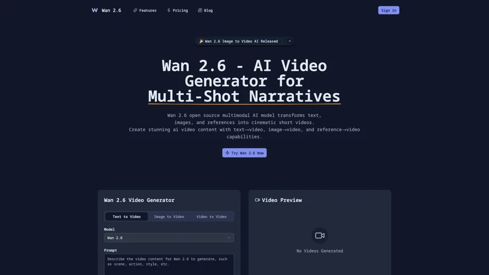 Wan 2.6 generates AI videos from text or images with multi-shot storytelling, reference video control, and native audio sync.